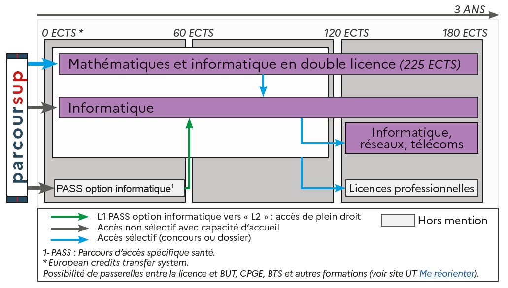 Les Licences « flexibles » s’appuient sur un ensemble d’Unités d’Enseignement (UE) obligatoires ou à choix permettant aux étudiants de s’inscrire dans un itinéraire permettant la validation de 180 ECTS (ECTS : système de crédits européens), sur une base de 60 ECTS par an. Le choix de l’itinéraire se fait en concertation étroite avec une direction des études et dépend de la formation antérieure, des orientations scientifiques et du projet professionnel de l’étudiant.- Parcours IRT : accès sur dossier après obtention de 120 ECTS,